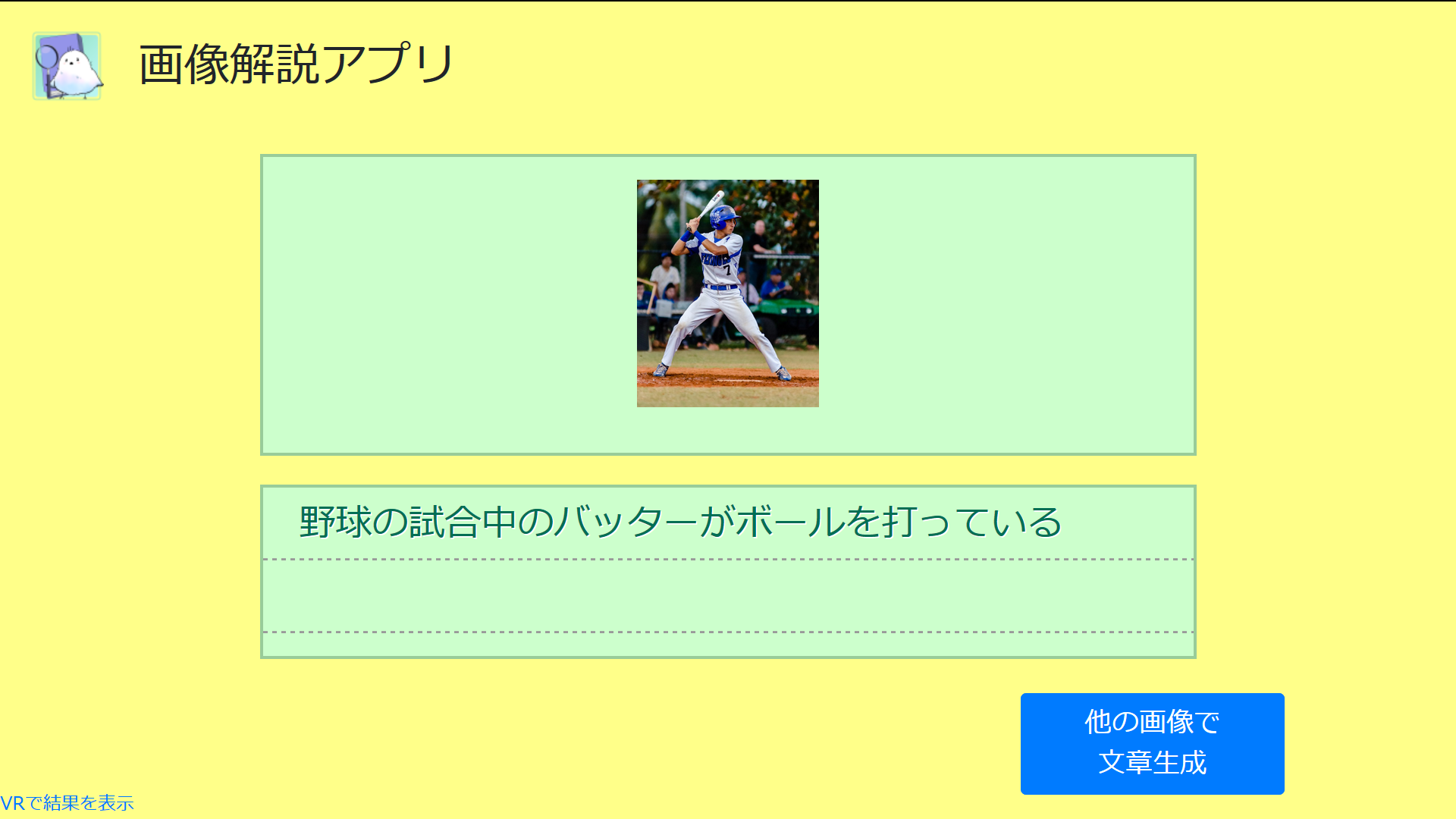 読み込んだ画像に対する、解説文を生成するアプリケーションです。