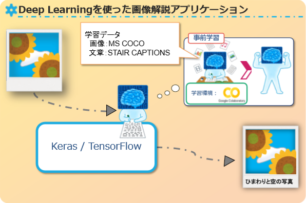 深層学習を用いて、読み込んだ画像に類似する画像を識別し、画像に関連付けられたキャプションを抽出・組み合わせることで、解説文を生成します。