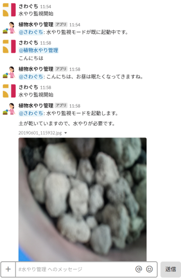 カメラ制御に Raspberry Pi を利用しており、Raspberry Pi への監視制御命令、および、ユーザ通知は Slack にて実現しました。(Slack API を利用)